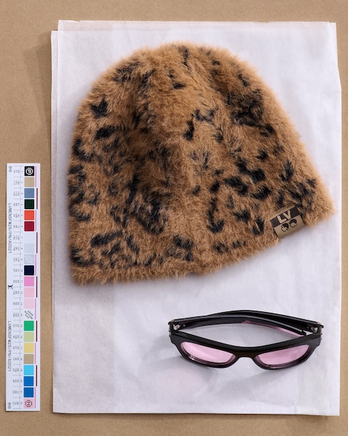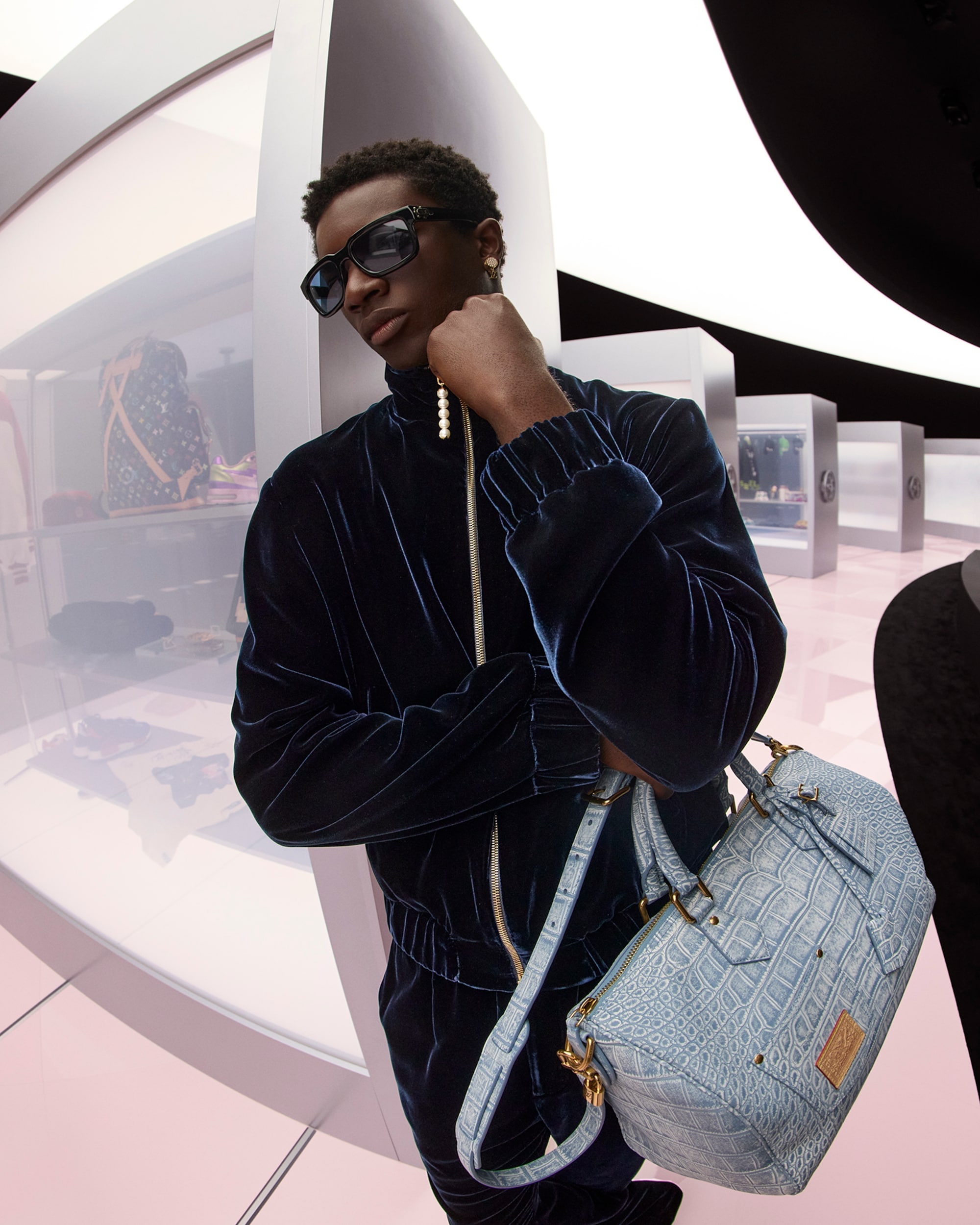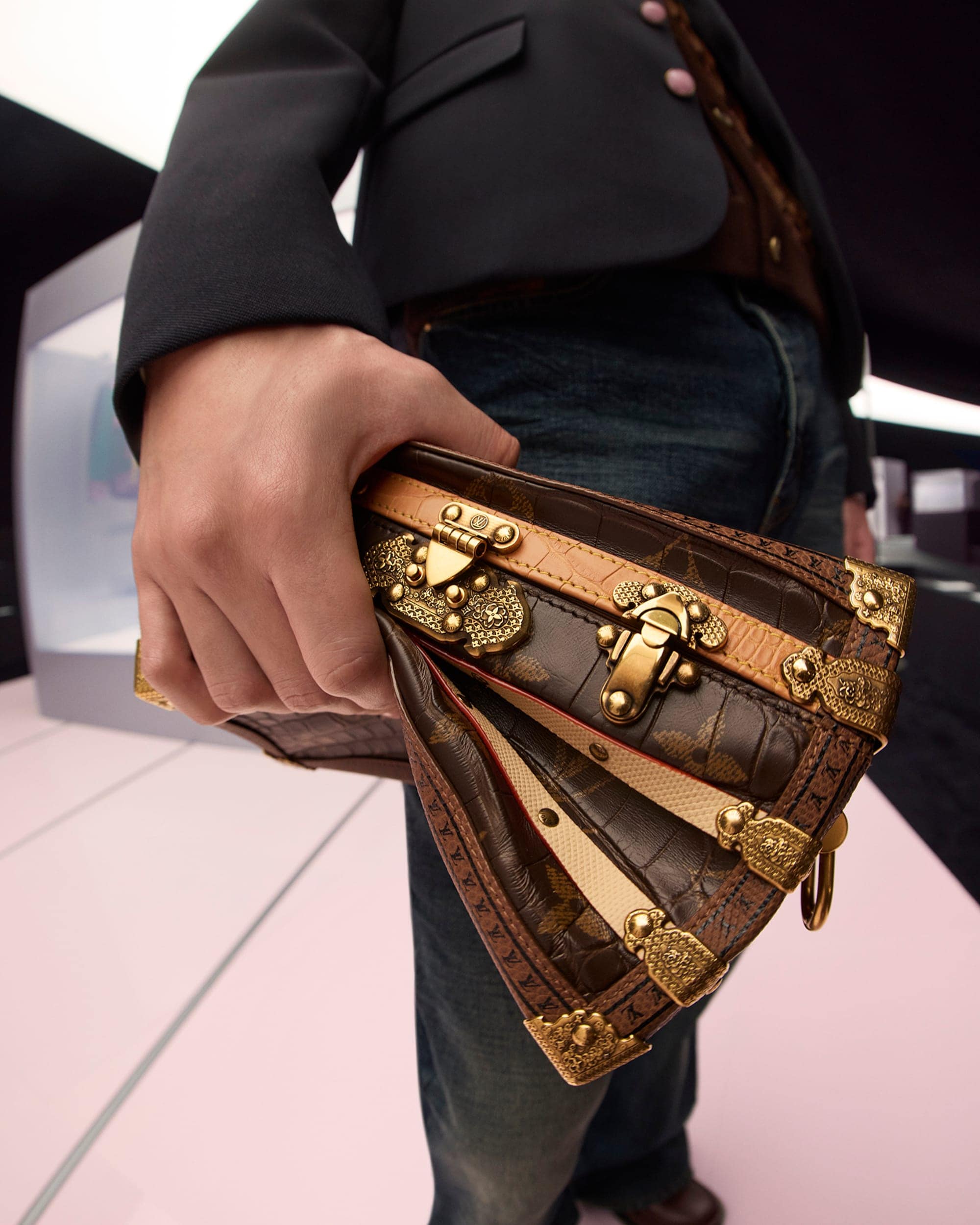 A spherical arrangement of archival vitrines orbits the Cour Carrée du Louvre, comprising 24 display cases that showcase coveted pieces from Louis Vuitton, Pharrell Williams, and Nigo — evoking a dialogue between past and future through cultural moments where the House and the collaborators converge.
