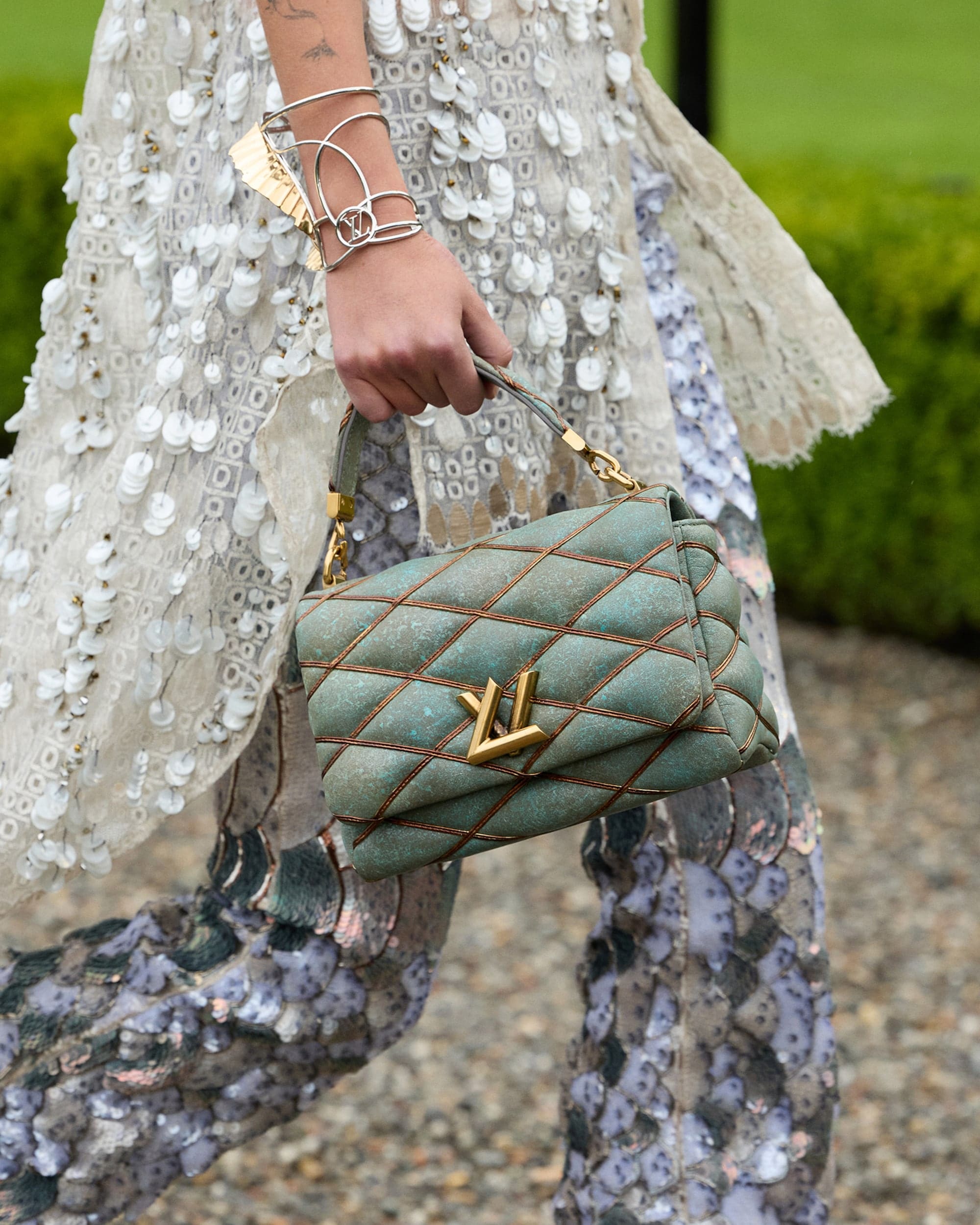 Reflecting the progression from nautical to botanical, the silhouettes are adorned with silks and sequined embroidery, emulating scales and the movement of water. On dry land, prints flourish and lines become sculptural, while bags mark a post-modern tale, enveloped in the new Monogram Dune or in colorful variations of Épi leather.