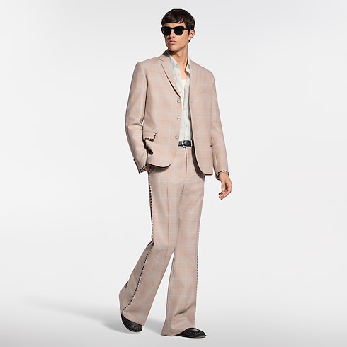 These flared pants from the Spring-Summer 2026 runway exemplify this season’s Indian Dandy aesthetic. Tailored from a fine wool glen check in elegant camel tones, they are adorned with embroidered beads resembling jewelry along the outer seam of each leg, while tone-on-tone Louis Vuitton Paris lettering discreetly signs the back. A matching jacket makes a standout suit.