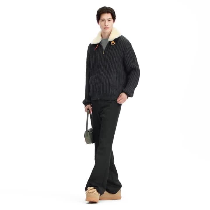 This dark gray zip-up blouson has a chunky ribbed knit crafted from luxurious cashmere-wool yarn with an open texture. It is topped with a cozy shearling collar, which can be secured with a buckled VVN-colored leather strap, and is signed with a Marque L.Vuitton Déposée patch in the same leather. This sophisticated yet relaxed piece is ideal for the winter season.
