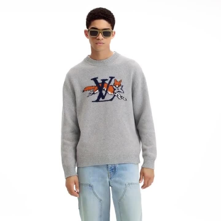 This long-sleeved chunky-knit crewneck features a playful intarsia motif inspired by the British countryside, with large LV letters and a leaping fox holding a Monogram Flower. It is crafted in pale gray wool-cashmere yarn and signed with a VVN-coloured leather Marque L.Vuitton Déposée patch on the back. A cozy and essential piece for the season.