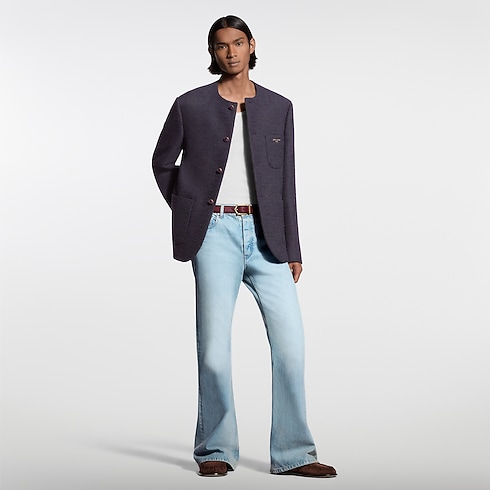 This chic collarless jacket draws inspiration from the Spring-Summer 2026 show’s Indian Dandy with its minimalist silhouette in rich purple indigo tones. It is tailored in soft wool-llama bouclette, while a striped lining adds a chic sartorial detail to the sleeves. Finishing touches include gold-toned Louis Vuitton Paris lettering on the breast pocket and violet tiger’s eye-effect buttons.