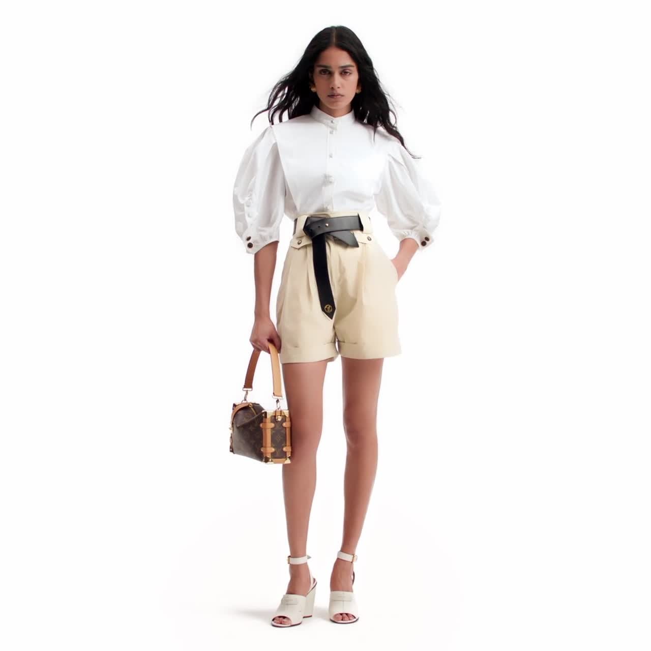These shorts are chic and summery in soft peach-effect cotton in a timeless shade detailed with elegant metallic buttons. They are cut in an airy wide-leg silhouette that is offset with a chunky high waistband for a flattering fit. Cuffed hems and two mini flap pockets finished with pleats complete the look with a dressy touch.
