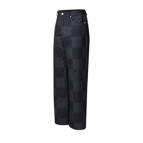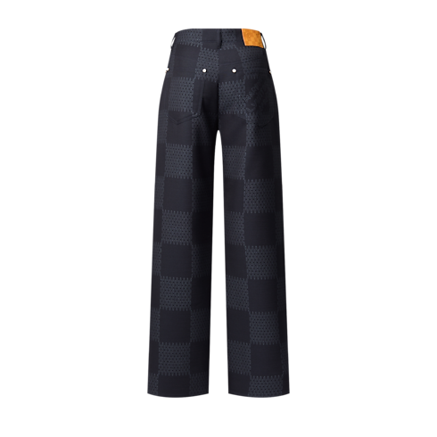 Blending comfort and sophistication, these pants elevate a classic five-pocket denim silhouette with fine jacquard wool. A large Damier motif is picked out with a delicate seed pattern in elegant navy tones, with ‘Marque L.Vuitton déposée’ signatures incorporated into the weave. Pearly studs and a pearl-effect button closure complete this piece, which has a matching jacket.