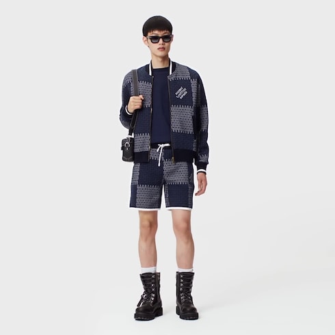 These cotton-blend jersey shorts are a casual yet elegant summer essential. They are elevated with a sophisticated large Damier jacquard knit with an ‘L.Vuitton Marque déposée’ signature on the left leg, while contrasting white trim accents the pockets and hems. A matching shirt and blouson turn this into a comfortable set for travelling.