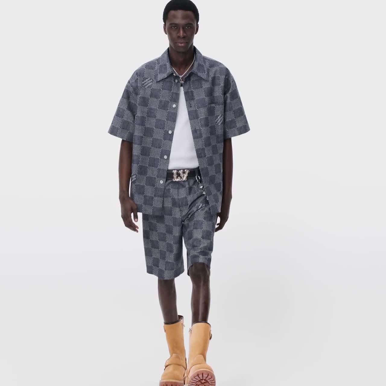 This graphic short-sleeved shirt elevates an effortless workwear silhouette with a sophisticated Damier jacquard with a delicate seed motif creating a feeling of lightness. ‘Marque L.Vuitton déposée’ signatures are incorporated into the fine chambray weave, while mother-of-pearl effect buttons lend a sophisticated finishing touch. Matching shorts make a refined summery look.
