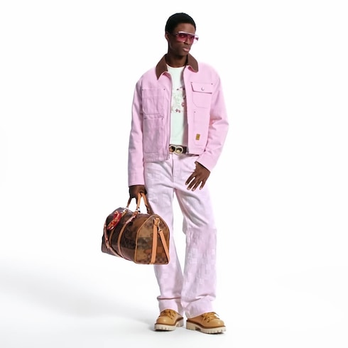 These denim skate pants are adorned with the Fall-Winter 2025 show’s iconic Damoflage Sakura motif in a sophisticated textured jacquard. The cherry blossom-pink tones draw on this season’s collaboration with Japanese designer Nigo. This summery buy-now-wear-now piece is signed with a nubuck Marque L.Vuitton Déposée patch on the ticket pocket and a Mini Damier jacqueron on the back.