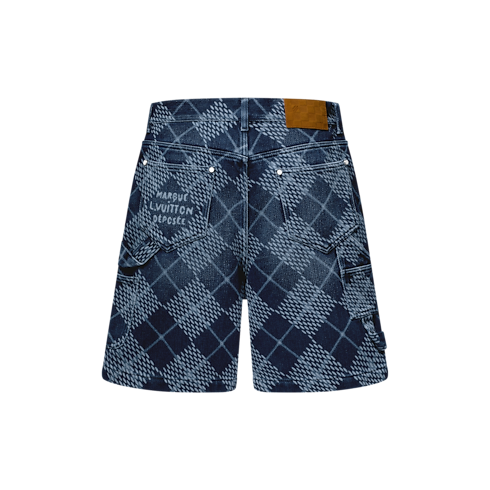 These graphic denim carpenter shorts offer a modern twist on a traditional Argyle pattern, with a bleached-effect allover Damier Argyle design incorporating the iconic House motif. Details include carpenter chaps and hammer holders, while Marque L.Vuitton Deposée signatures complete this on-trend design, which has a matching blouson for a total look.