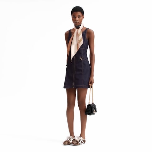 This mini dress has chic, everyday appeal in dark-wash denim cut with a fitted V-neckline top and an A-line skirt for a feminine silhouette. The front is detailed with a full-length exposed zipper trimmed with a Monogram canvas pull, which is complemented by a fastened slanted pocket on the hip.