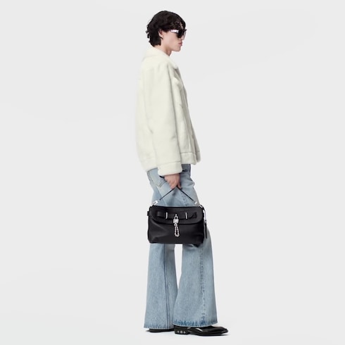 This white organic cotton t-shirt with a contrasting collar and cuffs has a slim Fit that perfectly complements the FW24 Show’s flared pants and dandy aesthetics. A buy-now-wear-now piece for summer, it is elevated with a graphic LV Vers motif front and back. Printed and ornamented with crystals, it features playful road signs that link Pharrell William’s home state of Virginia with Louis Vuitton in Paris.