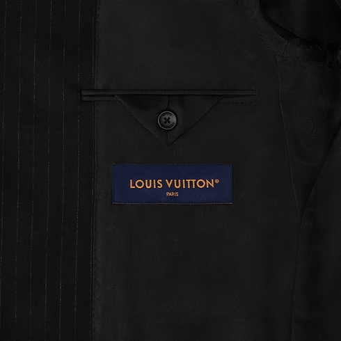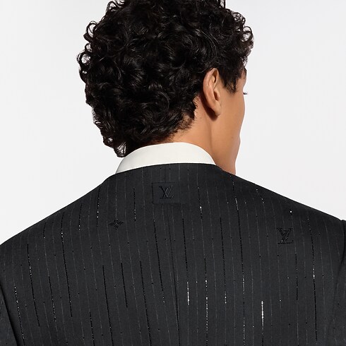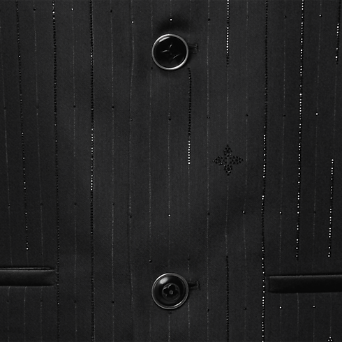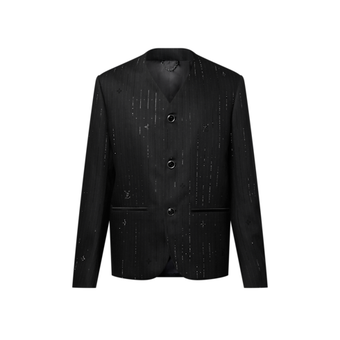 This distinctive black evening jacket draws on the iconic collarless style introduced by Pharrell Williams. The minimalist silhouette, featuring a V-neck opening and piped satin pockets, is adorned with glittering rhinestone pinstripes incorporating Monogram elements. LV cuff links and signature buttons add jewel-like accents. This richly detailed piece brings a sophisticated finishing touch to an evening look.