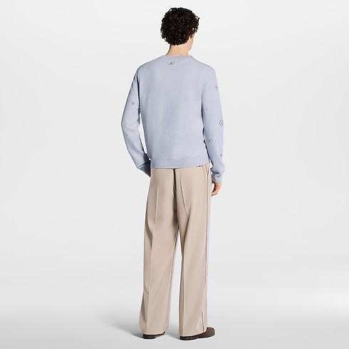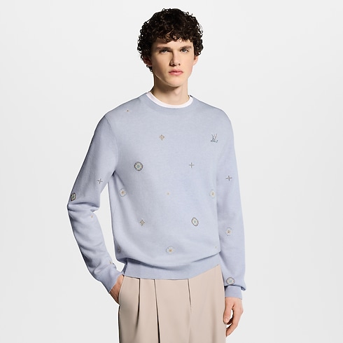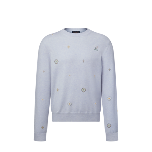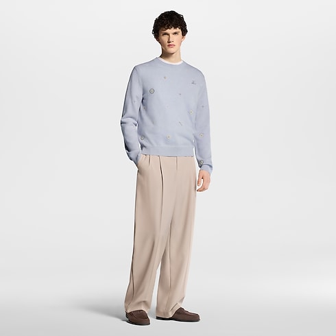 This pale lavender pullover is crafted from responsibly sourced lambswool in a fine knit, bringing a fresh and cheerful accent to spring looks. It is adorned all over the front and sleeves with a delicate rhinestone Blooming Monogram motif adding a chic accent that can carry from day through to casual evenings, while LV signatures adorn the chest and back.