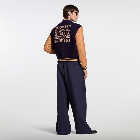 This luxe Varsity jacket, inspired by the Spring-Summer 2026 show’s Indian Dandy, features a purple Indigo wool body and VVN-colored calfskin sleeves. Meticulous, jewel-encrusted embroidery celebrating centuries-old Indian craftsmanship frames a glossy L.V.M. signature on the chest, while this season’s LV Alphabet motif adorns the back in lustrous 3D embroidery. Pearly snap buttons complete this princely piece.