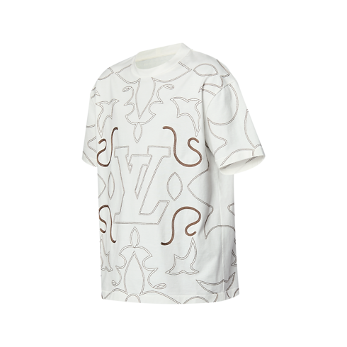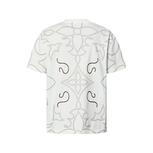 This graphic t-shirt is embellished with an allover LV Arabesque motif from the FW24 Show, delicately embroidered in contrasting yarn against soft white cotton jersey. The ornate motif - inspired by the stitching on cowboy boots - incorporates Monogram Flower signatures and an LV on the chest, elevating casual looks with a romantic yet modern vibe.