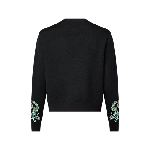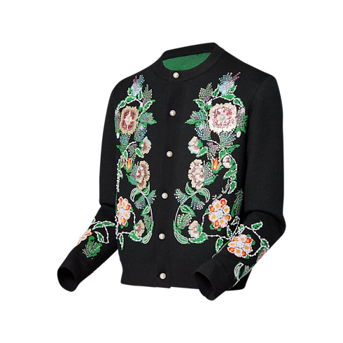 This elegant black cardigan is crafted from responsibly-sourced fine merino wool and adorned with a jacquard floral motif inspired by the FW24 Show’s vintage Western aesthetic. Crystals, pearls, sequins and beads are worked into the design by hand, adding couture-like embellishment. Pearl-effect buttons complete this sophisticated piece, which elevates both casual and timeless looks.