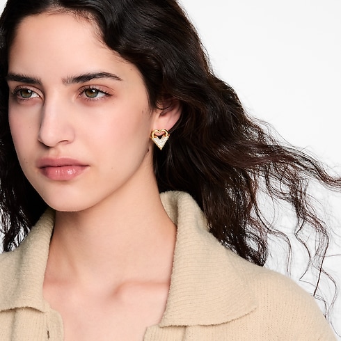 Inspired by the magic of love and affection, the Essential Love earrings combine eye-catching elegance with a subtle Louis Vuitton signature. Their striking design features a heart crafted in gold-toned metal, integrating the House’s distinctive V emblem enlivened with dazzling rhinestones. Easy to wear, these sophisticated earrings add a touch of romantic charm to any look.