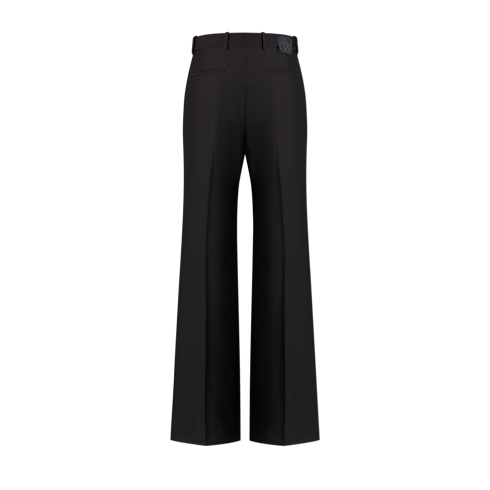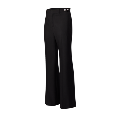 These tailored flared pants, crafted in luxurious grain de poudre wool, bring a flattering elongated shape to a sartorial silhouette. Pearl-effect buttons applied on the adjustable waist add a sophisticated dandy twist. This versatile piece in dark tones completes the collection’s elegant nautical looks.