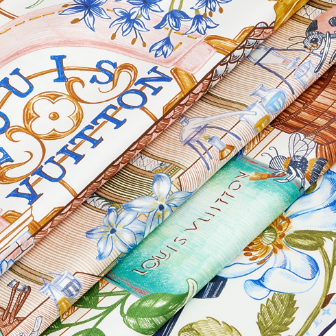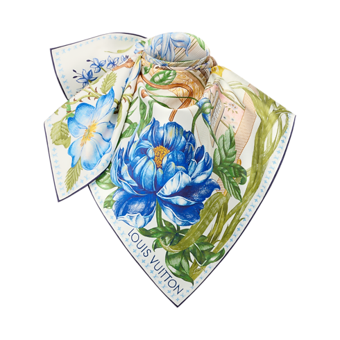 The all-silk Fontaines Parfumées square captures the essence of Louis Vuitton in an intricate design inspired by the art of fragrance. Its colorful pattern depicts a vintage-style perfume extractor surrounded by delicate flowers, with the House’s perfumery atelier in the background. An elegant, feminine accessory, infused with the harmony of craftsmanship and nature.