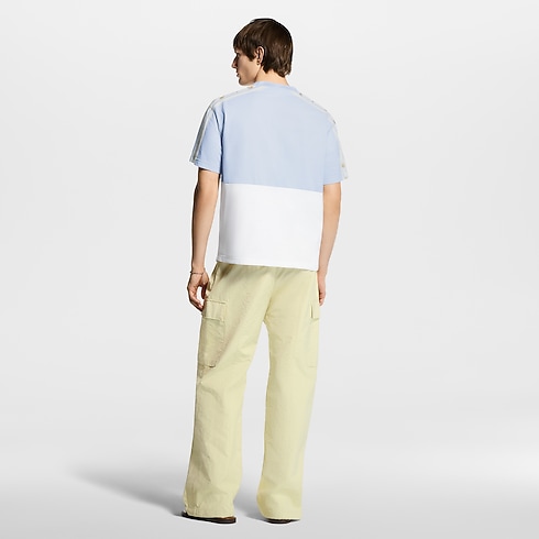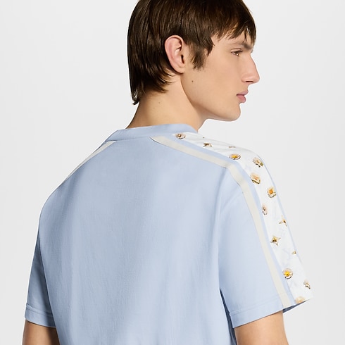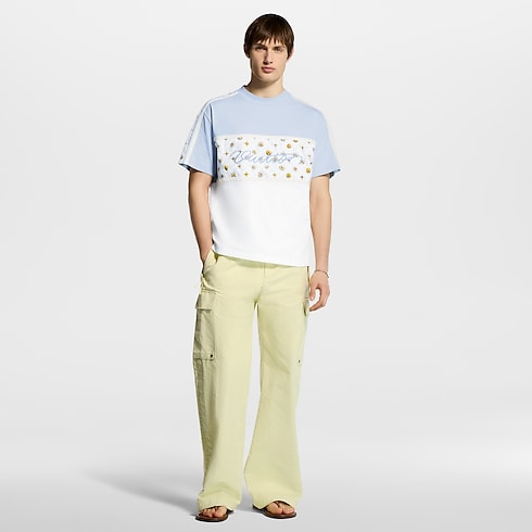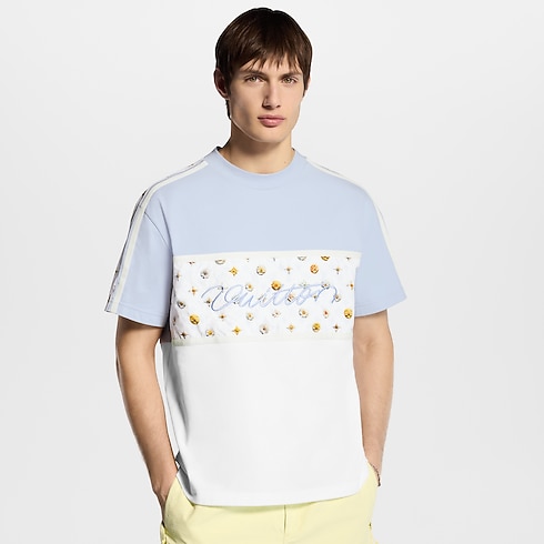 Playful spring florals adorn this color-blocked pale blue and white organic cotton T-shirt. A Blooming Monogram motif adorns sporty inserts across the chest and on the sleeves, while an embroidered cursive Vuitton signature in lustrous yarn signs the front. Easy to style with this collection’s pastel tones, this T-shirt lends a graphic accent to casual looks.