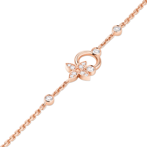Delicately crafted in pink gold and accented with lustrous diamonds, the Idylle Blossom bracelet features an original asymmetrical design. Its centerpiece is a star-shaped Monogram Flower, a House icon introduced by Georges-Louis Vuitton in 1896, juxtaposed with a circle to create an artistic interplay of forms and volumes. An adjustable fine-linked chain makes it easy to wear, alone or stacked with other bracelets.