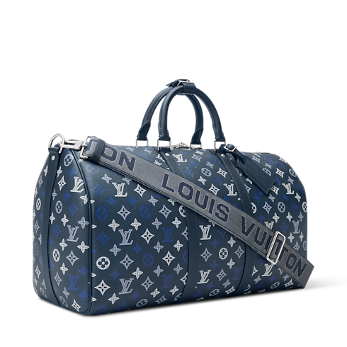 Monogram Shadow calfskin, finished with a gradient effect achieved through a triple Monogram serigraphy technique, brings depth and refinement to the Keepall Bandoulière 50. The bag features a removable reinforced cotton strap, offering tactile contrast and a modern bicolor Louis Vuitton signature, and is lined in navy-blue textile.