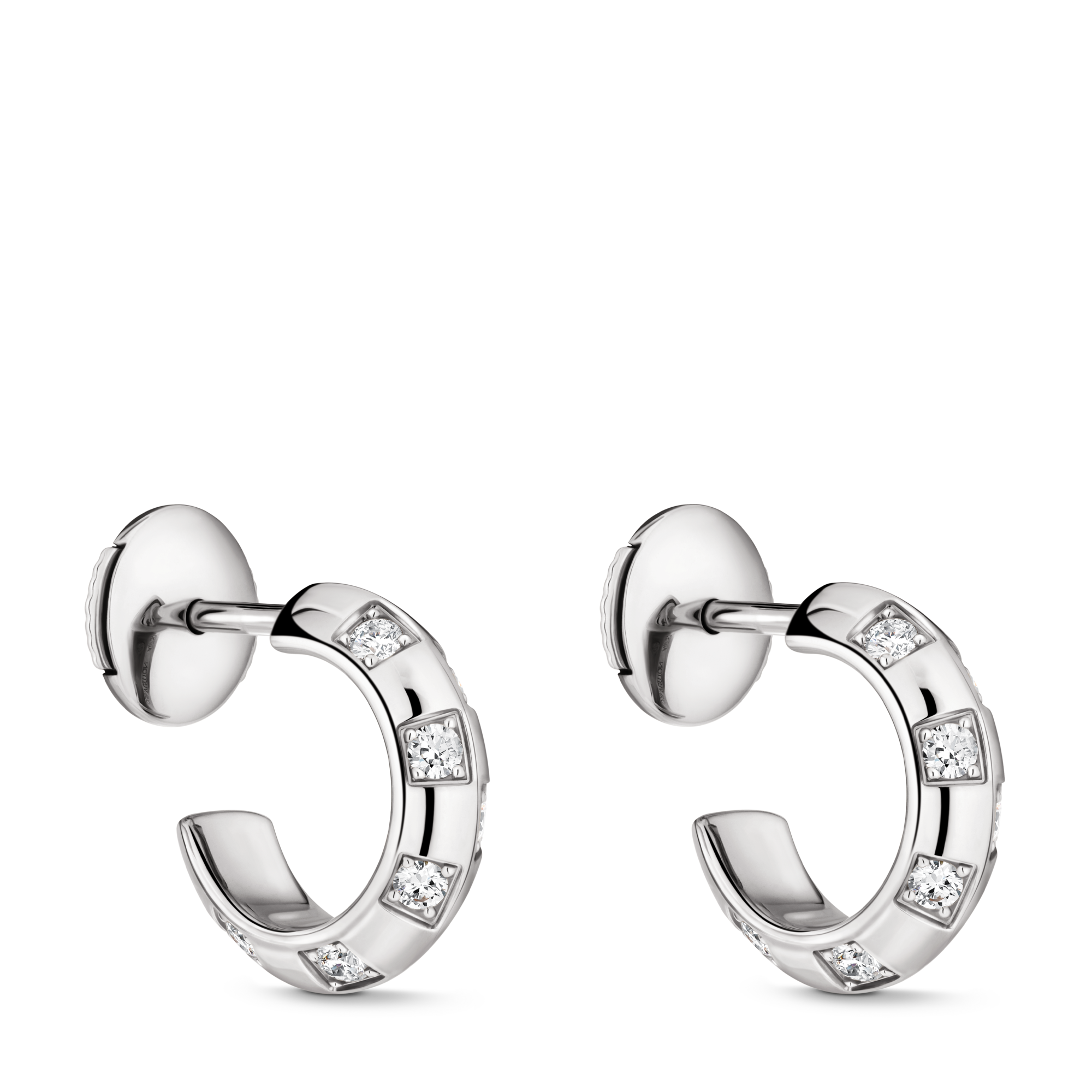 The graphic genderless style of Le Damier de Louis Vuitton hoops makes them a unique combination of contemporary artistry and classic heritage. Delicately crafted in hand-polished 18-karat yellow gold set with radiant diamonds, their design evokes the House’s iconic Damier motif, a timeless symbol of infinity created by Louis and Georges-Louis Vuitton in 1888. Designed to be combined with other jewels, these exceptional hoops are meant to be worn every day – and never taken off, becoming an authentic second skin.