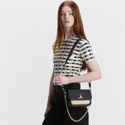 Fashioned from supple grained calf leather, the Lockme Tender cross-body bag comes with a wide removable and adjustable strap in addition to its traditional gold-color chain. Each side of this versatile strap has a different color and texture. A metallic D-ring on the strap means it can be personalized with a charm.