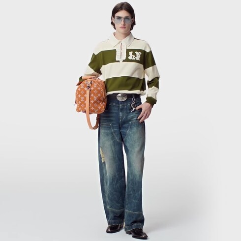 This piece brings a chic twist to the rugby polo with a ruffled button placket that draws on the FW24 Show’s dandy Western universe. The classic graphic rugby stripes are further embellished with an ornate printed LV on the chest and playful retro slogans on the back. Crafted in soft cotton jersey, this long-sleeved polo elevates laidback looks.