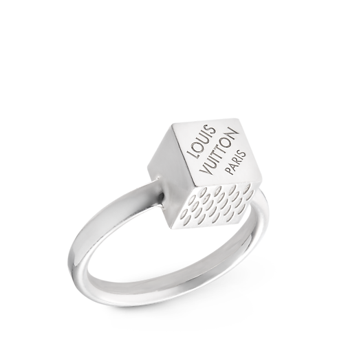 This exceptional sterling silver ring joins the LV Cube collection, inspired by a puzzle game called Pateki invented by Gaston Vuitton in 1932. Its centerpiece is a cube elegantly engraved with a Louis Vuitton Paris signature and delicate stripes recalling the look of the House’s historic Damier canvas. Perfect for adding an eye-catching glint of sophistication to any outfit.
