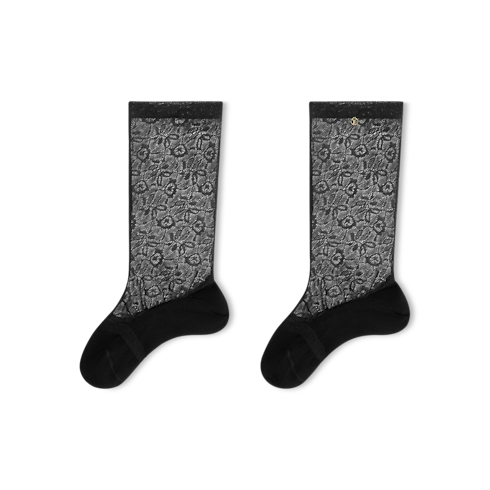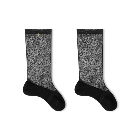 The lace-inspired design of the LV Floral socks updates a wardrobe essential with couture refinement. The blend is adorned with an intricate floral pattern, accented by a gold-colored LV Circle emblem for a subtle House signature. Expressing power and femininity, these statement socks enhance any outfit with a daring yet delicate touch of elegance.