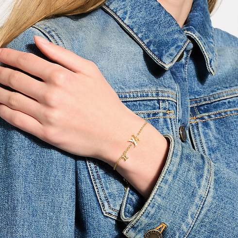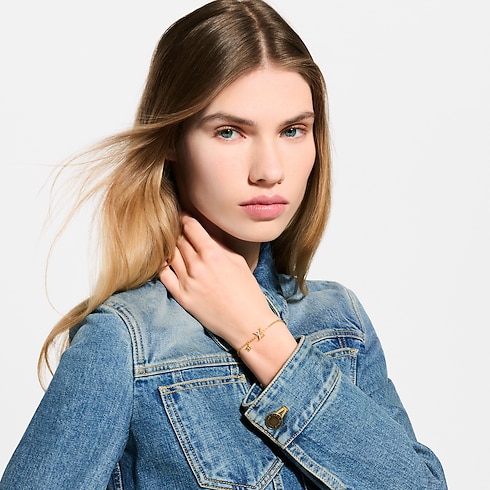 Incorporating the House's distinguished symbols into casual looks is effortless with the LV Iconic bracelet. This dainty piece is adorned with LV Initials encrusted with shimmery crystals, a tiny Monogram Flower and a finely engraved plaque. The adjuster chain at the back ends with a dangling LV Circle charm for an additional signature flourish.