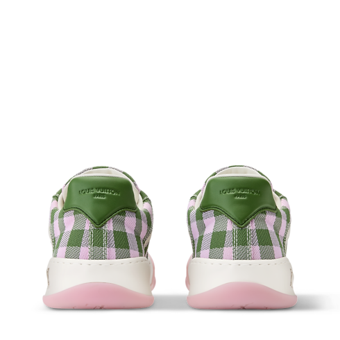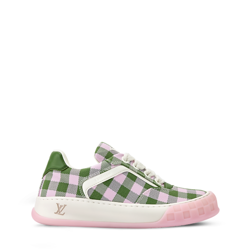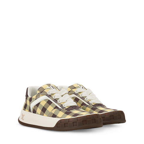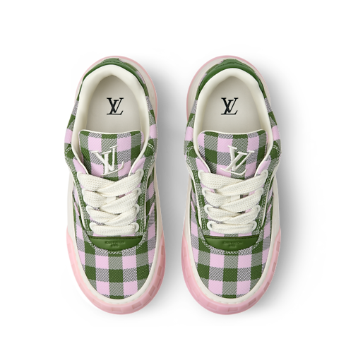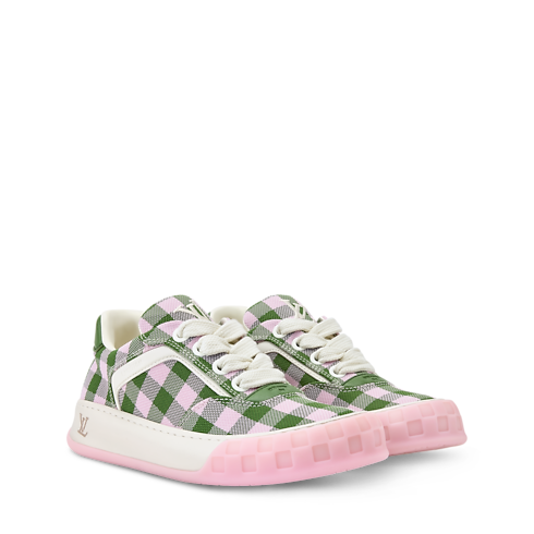 The LV Tilted sneaker comes in a mix of materials with a colorful gingham print, a key motif of the season. Inspired by vintage sneakers and skate shoes, this model is named for the tilted LV Initials on its tongue and outsole, which evoke the motion of skateboarding. Other distinctive details include the Damier pattern on the two-tone outsole.