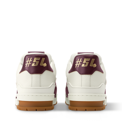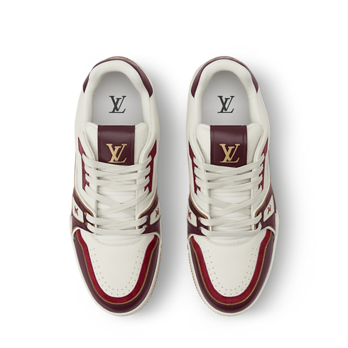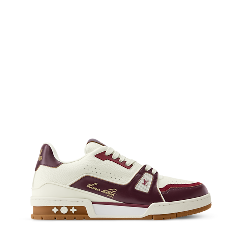 This refined interpretation of the LV Trainer sneaker combines grained and aged calf leather, fusing vintage-style materials with a contemporary design. This iconic model, which was inspired by classic basketball sneakers, is notable for its elaborately constructed upper, which features multiple House signatures, and its technical rubber outsole with Monogram Flowers.