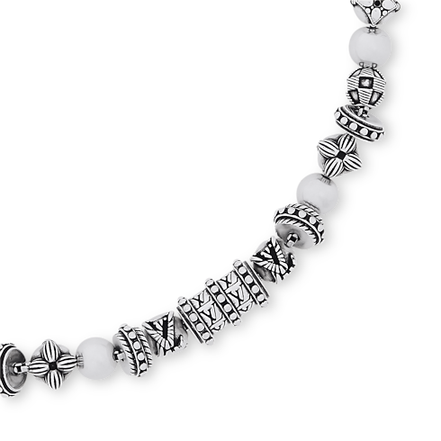 The LV Whisper Beads necklace is a refined yet bold pieces that celebrates House signatures and global references. Constructed from sterling silver, the textured strand hosts Monogram Flowers and the House Initials, intricately etched onto a variety of sculptural shapes. Beads designed with a guilloche effect are a celebration of Indian craftsmanship.