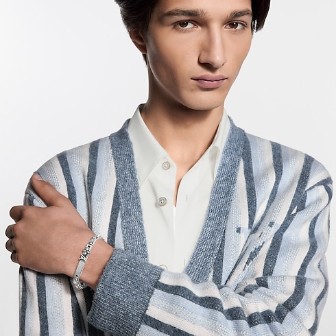 The LV Whisper Gourmette bracelet is a cutting-edge adaptation of the classic ID plate look. Complete with plaited links and an engraved clasp, the style is studded with a pair of LV Initials and a single Monogram Flower. The outcome is an easygoing piece that captivates on its own or stylishly stacks with additional bracelets.