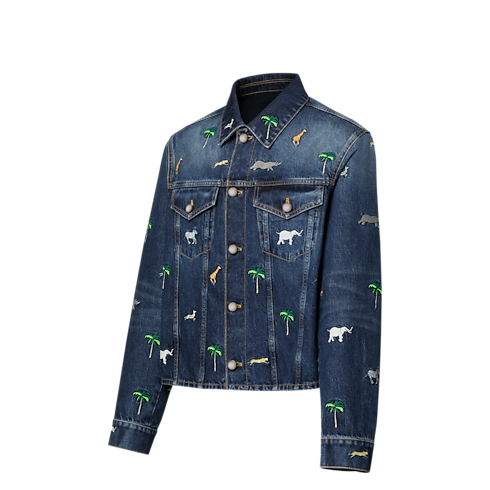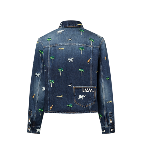 This graphic denim shirt is adorned with the Spring-Summer 2026 show’s LV x The Darjeeling Limited motif, featuring vibrant embroideries of animals and palm trees in a nostalgic ode to travel. This season’s L.V.M. signature adorns a patch pocket on the back, while pearly buttons add a Dandy twist to the trucker-inspired silhouette. Pair with matching pants for a total look.