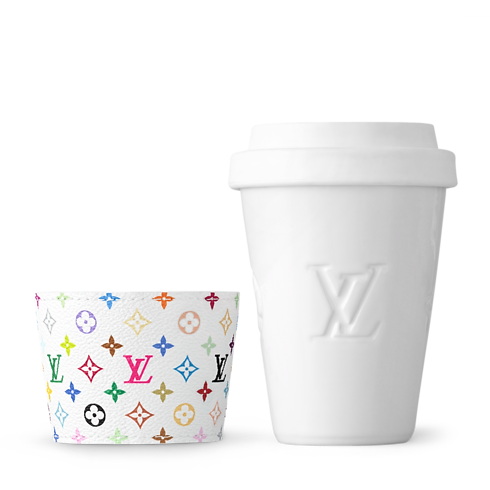 With the LV x TM collection, the Maison renews its collaboration with noted Japanese artist Takashi Murakami and introduces an exclusive range of giftable designs: witness this collectible edition of the LV x TM cup, crafted from light, portable ceramic. The removable sleeve features Murakami’s Monogram Multicolor motif, a vibrant take on the iconic House pattern. A natural cowhide leather tab secured with golden rivets adds a refined, signature touch.