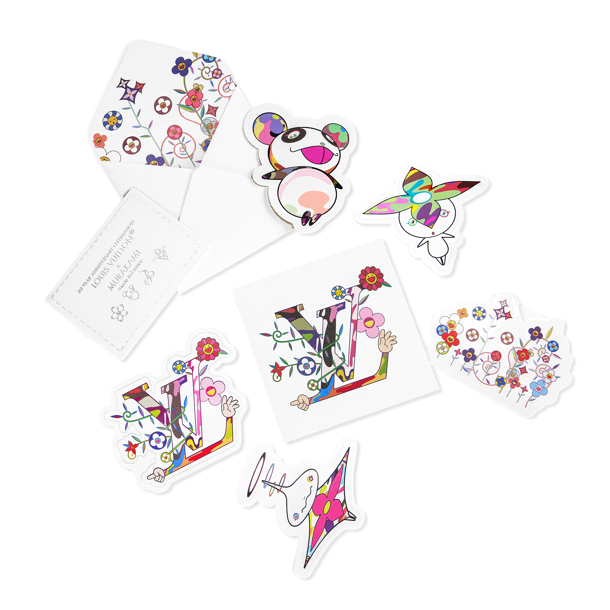 For all online purchases, the pieces from the collection are wrapped in vibrant, colorful packaging, accompanied by a sheet of stickers featuring Takashi Murakami's playful characters — available while stocks last.