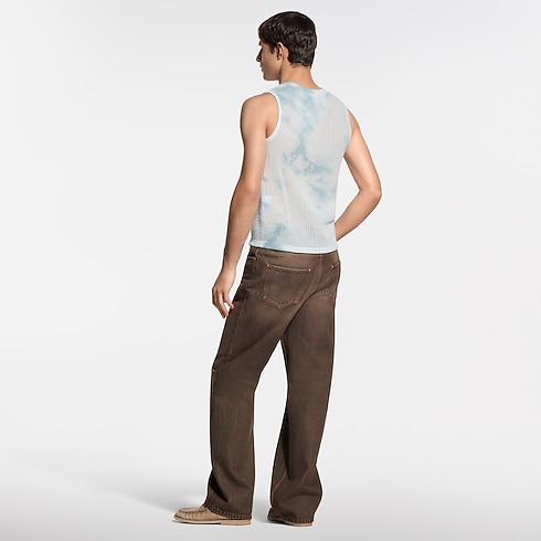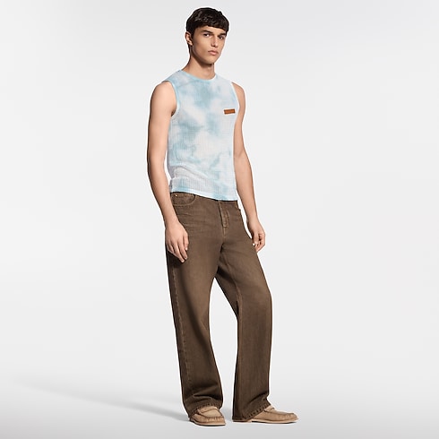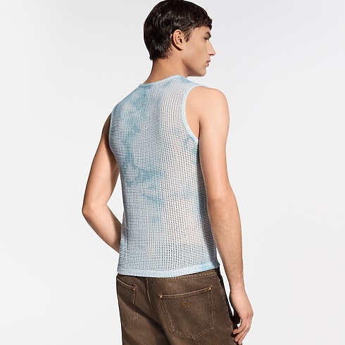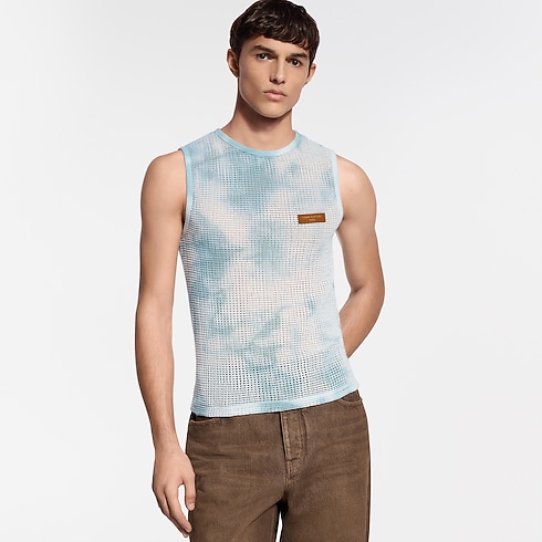 This pale blue cotton mesh tank top draws on the Spring-Summer 2026 show’s Indian inspiration, with a mottled garment-dyed treatment creating a sun-faded effect rendering each piece unique. A leather Louis Vuitton Paris patch signs the left chest, while ribbed trim finishes the armholes and collar. This casual piece is perfect for layering with this season’s subtle colors and textures.