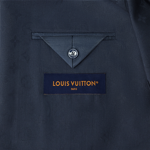 This softly tailored single-breasted Napolitana jacket is light, comfortable and elegant. The timeless navy blue wool fabric is elevated with a tone-on-tone jacquard Monogram motif offering a subtle play of matte and lustrous accents. Matching drawstring pants make a refined set that can be dressed up or down, with a matching shirt or a light knit for an effortless look.