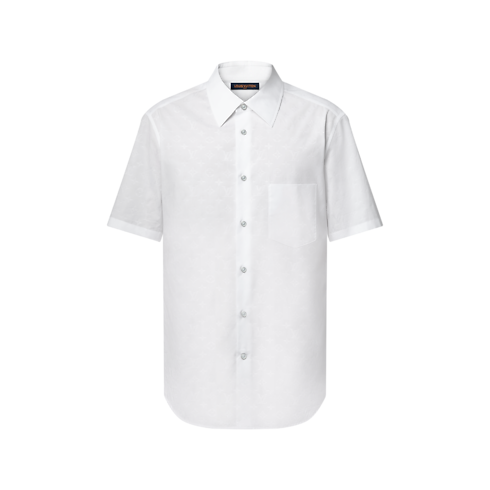 This short-sleeved classic shirt is a fresh choice for warm weather, crafted from white organic cotton with a tone-on-tone Monogram jacquard. An LV top button and a woven LV and Monogram Flowers label adorn the placket. This versatile piece can be paired with a matching Monogram Napolitana suit for a refined play of layers.