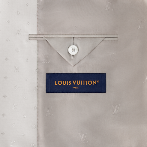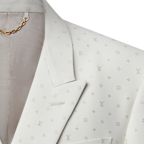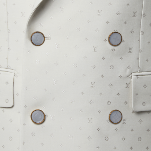 This chic double-breasted evening jacket in a pale ivory hue stands out from the crowd for summery celebrations. It has a tone-on-tone jacquard Spaced Mini Monogram motif expressed in a subtle play of matte and lustrous textures thanks to the fabric's luxurious silk and mohair content. The sleek silhouette—an icon of dandy wardrobe style—makes a sharp suit with matching pants.