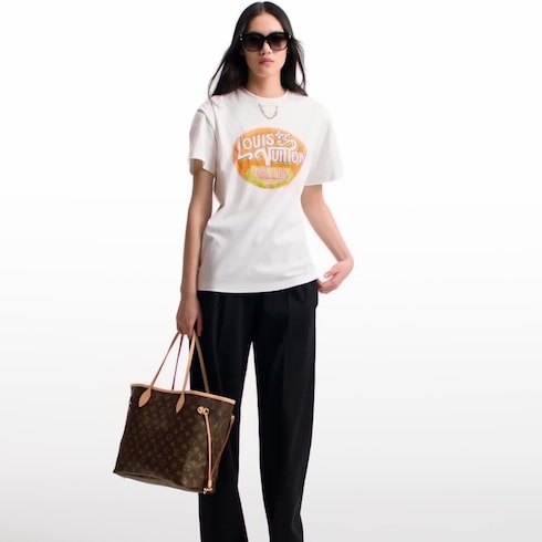 This T-shirt makes an upbeat statement with a large, colorful print on the chest in the style of a retro travel stamp detailed with a Louis Vuitton Paris signature. It is cut from soft, breathable cotton jersey and embellished with an LV chain detail at the neckline for a modern House touch.