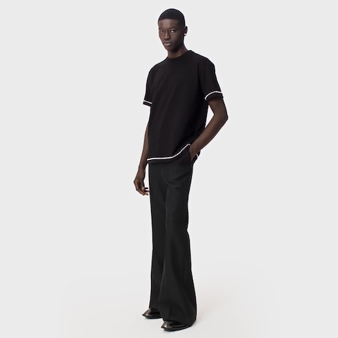 This black cotton t-shirt is embellished with pearly studs around the sleeves and bottom hem, bringing a sophisticated dandy twist to a classic silhouette. A tonal ‘L.Vuitton Marque déposée’ embroidered on the chest with a relief effect in lustrous yarn adds a refined signature to this casual yet elegant piece.