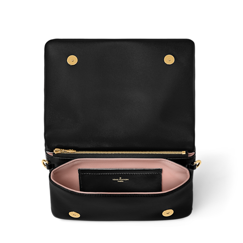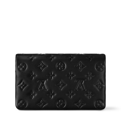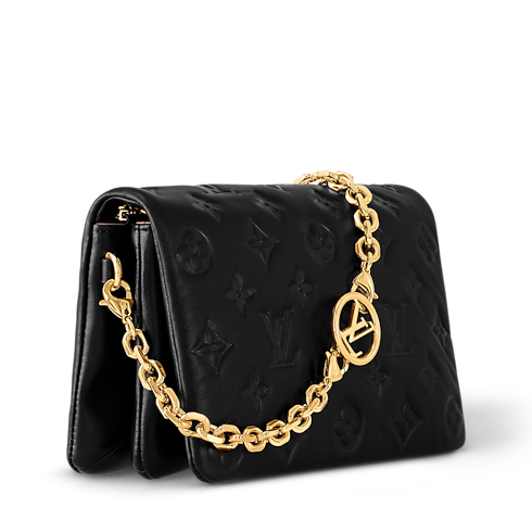 The Pochette Coussin is crafted from soft lambskin, which is embossed with the Monogram pattern to create a puffy, cushiony effect. This is further enhanced by the construction of the pouch, which gives it a supple, body-friendly shape. The removable chain, decorated with a Louis Vuitton charm, offers different carry options: clutch, shoulder or belt.