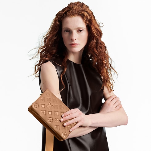 The Pochette Coussin is crafted from soft lambskin, which is embossed with the Monogram pattern to create a puffy, cushiony effect. This is further enhanced by the construction of the pouch, which gives it a supple, body-friendly shape. The removable chain, decorated with a Louis Vuitton charm, offers different carry options: clutch, shoulder or belt.