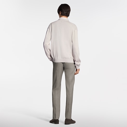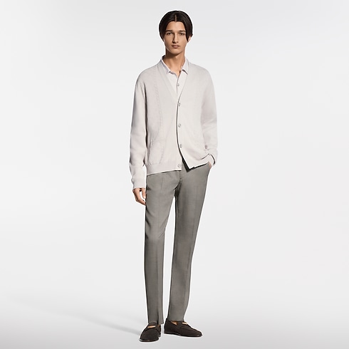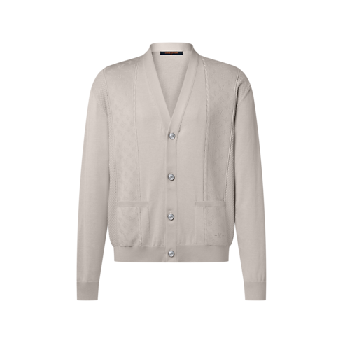 This elegant ivory cardigan is a versatile layering piece in the modern formal wardrobe. Crafted from a lustrous cotton-silk blend, it features a light and airy pointelle knit incorporating tone-on-tone bands of Monogram and Damier signatures. Combining comfort with preppy elegance, it can be worn with a suit or styled with smart chinos for a refined and contemporary look.