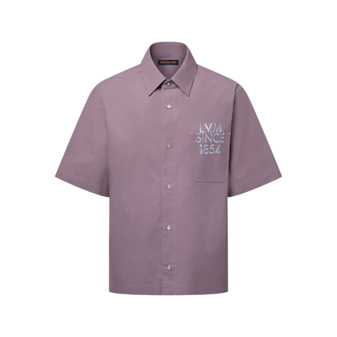 This crisp, short-sleeved lilac shirt complements this season’s subtle colors. Hand-painted effect printed signatures from the Spring-Summer 2026 show lend graphic accents, with L.V.M. Legacy lettering over the breast pocket and an LV Alphabet motif across the back. Mother-of-pearl effect buttons add a lustrous finishing touch.