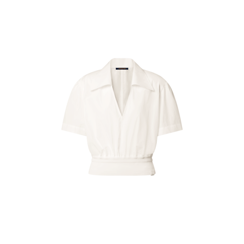 Taking style cues from casual pajama styles, this blouse is crisp and comfortable in equal measure. It is crafted from airy cotton poplin in a short-sleeved shape with a sharp V neckline and a pointed collar, while the cropped waistline is cinched with ribbing for a defined fit. Discreetly signed with a leather LV Circle tab.