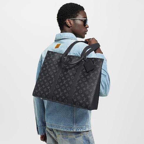 Monogram Eclipse canvas brings masculine elegance to the Sac Plat 24H. Recognizable by its lateral bands, handle mounts, and removable name tag, this tote boasts a large capacity and a mix of zipped and flat pockets, including one large enough for a laptop. It has short handles for hand carry, and long handles for shoulder carry.